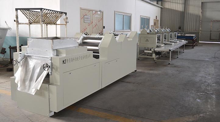 This equipment consists of a dough pressing mechanism, a dough sheeting mechanism, a pressing needle mechanism, a chain drive mechanism, and a main frame. It can be combined with dough mixers and other machines to form a fully automated system for dough mixing, sheeting, stamping, conveying, drying, packaging, and weighing.